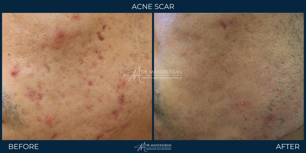 Before treatment, scars may look deep and uneven. After, skin texture improves with reduced scar visibility and smoother tone.