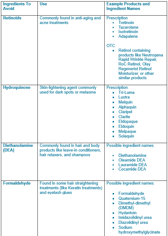 • Retinoids (Retinol, Retin-A):Linked to birth defects and should be avoided.
